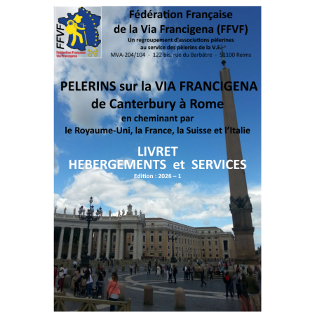 Ainsi le Livret 2026 (version FR) de 100 pages au format réduit (16,8x11,8), au prix de 12€ énumère les divers types d'hébergements, de commerces et de services disponibles sur la totalité du parcours historique de la VIA FRANCIGENA et de ses variantes, depuis Londres et Canterbury jusqu'à Rome.